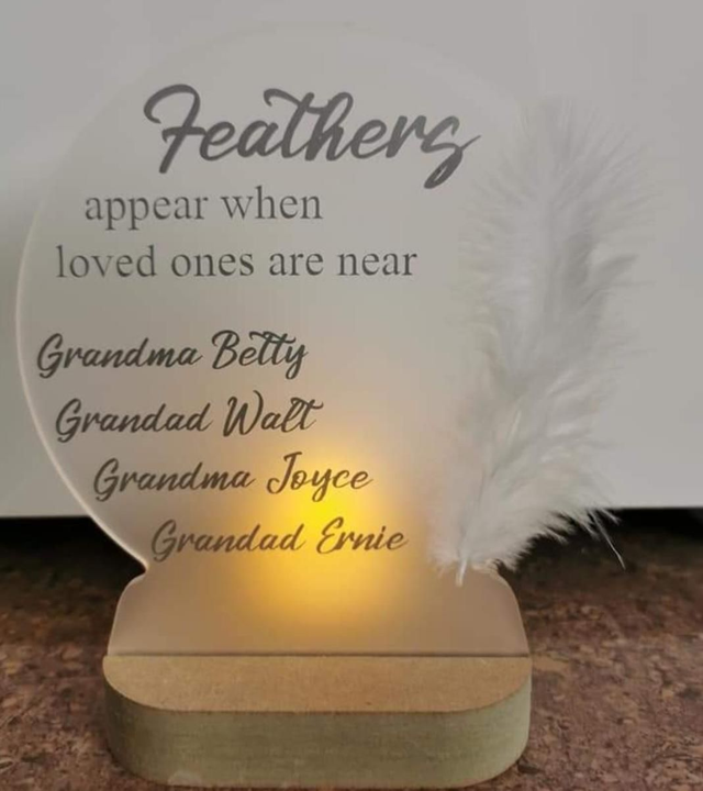 Frosted snow globe shape plaque with wooden base, complete with cut out area at the back for a battery tea light. Fully personalised memory globe plaque complete with white feather (many vinyl colours available) ❤️ only £12.50 ❤️